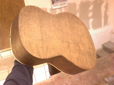 i've done all i can with this guitar and now we glue this monster back together. i only own a few clamps and a real guitar builder would not be proud at this sad display.